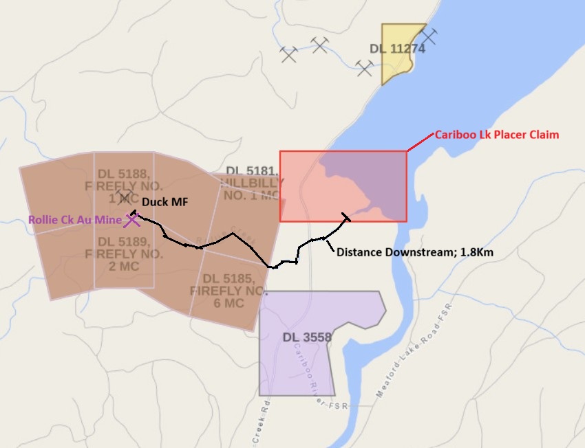 The Cariboo placer claims Tenure 1131192 (2 cells) In Application submission on March 17, 2026. The prolific Cariboo Area has produced gold for over a hundred years including from fine grained to nugget and larger sized gold. The closest Minfile is the Rollie Creek MF located 1.8Km southwest upstream of the Cariboo Lake PCX claim (See Map 2). And the Cariboo Lake Placer Claim is located 14.5 kilometers Northeast of Likely, British Columbia.
