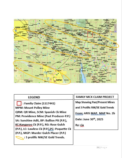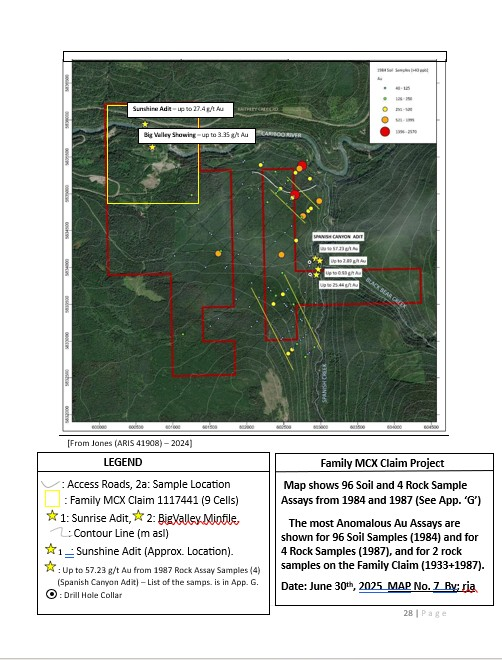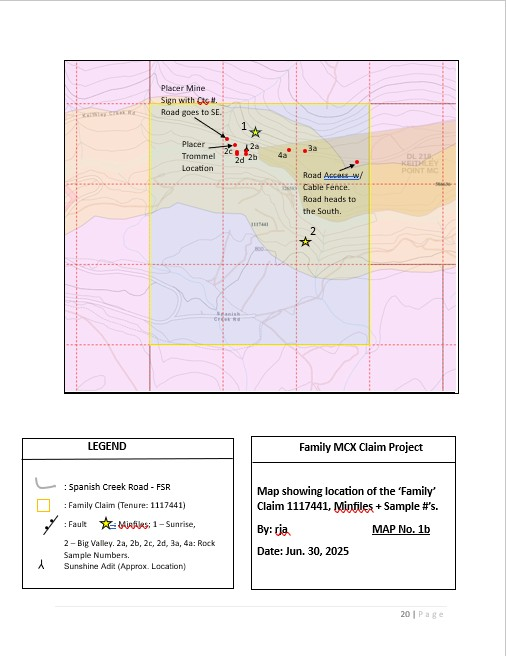 Family Claim MCX Claim; 9 Cells including; Tenure 1117441 (9 cells). Two Minfiles on the claim include the Sunshine, and the Big Valley (See Map 1b). In summary the Sunshine MF the area is within the Quesnel terrane of the Intermontane Belt near its eastern margin, adjaceant to the Precambrian to Paleozoic rocks of the Omineca terrane. The main lithologies consist of red brown weathering phyllite,grey siltstone, and interbedded felsic tuffs, which form the lowermost part of the Upper Triassic to Lower Jurassic Nicola Group. Formerly referred to as the “Black Phyllite” this unit has been thrust onto the older Omineca terrane rocks, and as a result have been deformed and metamorphosed, likely during Middle to Late Jurassic time to . Locally, an adit, known as the Sunshine adit, that is caved or collapsed, exposes a northwest striking quartz vein hosted in a schistose argillite. The vein is approx. 3.6 metres wide and hosts irregular galena mineralization. A selected sample across a 3.5 metre section was assayed at 27.4 grams per tonne gold (Energy Mines and Petroleum Resources Annual Report 1933, p. A136) See Map 7. In 1987, another sample (685) from a small quartz vein, did assay 0.45 gram per tonne gold, 267.7 grams per tonne silver, 4.04 per cent lead and 4.45 per cent zinc (Assessment Report 17103). Another occurence located 100m downstream of the adit is comprised of a 30 by 30m area of pulaskite hosting quartz-carbonate stringers with sparse galena. A select sample assayed 41.4gpt Ag (ARIS 9916). Additional work included regional prospecting and sampling by Keweenaw Syndicate in 1967. During 1981 through 1984, Apex Energy completed programs of airborne and ground geophysical surveys, prospecting, geological mapping and soil sampling on the area as the Nov 1-3 claims. During 1984 through 1986, Mt. Calvery Resources completed programs of geological mapping, prospecting, trenching and geochemical sampling on the area. In 1987, Malcom Resources completed a program of soil sampling, prospecting and trenching on the area.