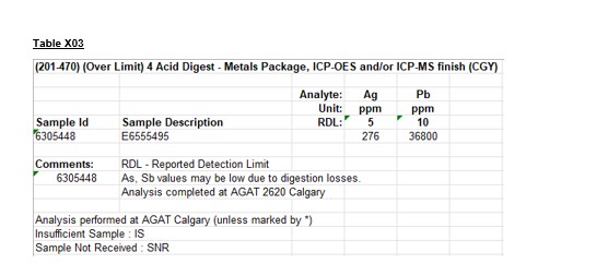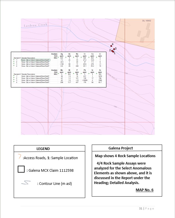 Also attached below are inhouse multi-element Assays, Overlimit Assay Table, and Map 7 with the sample locations and Assay Results outlined on the map.