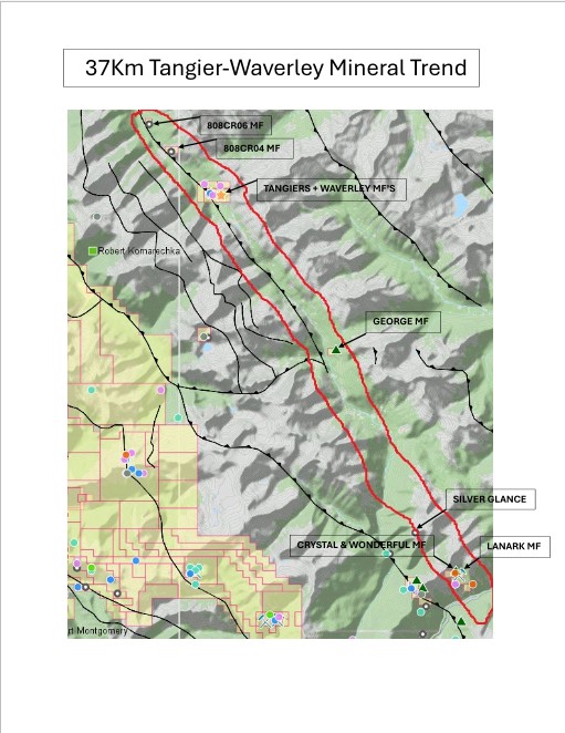 The Landmark and Dorthy MCX Claims tie into a NW/SE Mineral Trend that runs from the North Tangier/Tangier-Waverley/George MCX Claims for ~37Km (See Map Below). On this trend are MF’s that report Polymetallic veins of Au-Ag-Pb-Zn-Cu of prolific proportions for certain claims. And as for the Crystal & Wonderful MF (Prospect) as shown on the Map to the right, the underlying sediments are Lower Cambrian and younger Lardeau Group carbonaceous schist, slate, and limestone that strikes NW with a steep NE Dip. Galena commonly appears on the Crystal claim, and the main Lanark vein is reported to strike across the claim. A 45cm exposure of galena in a quartz vein is hosted by slate and carbonaceous schist in an open cut. This mineralized vein was explored by 2 short Adits where in the lower adit a 38cm channel sample assayed 60% Pb, 6% Zn, 2588gpt Ag, and 0.68gpt Au (Minister of Mines Annual Report 1923, page A233).