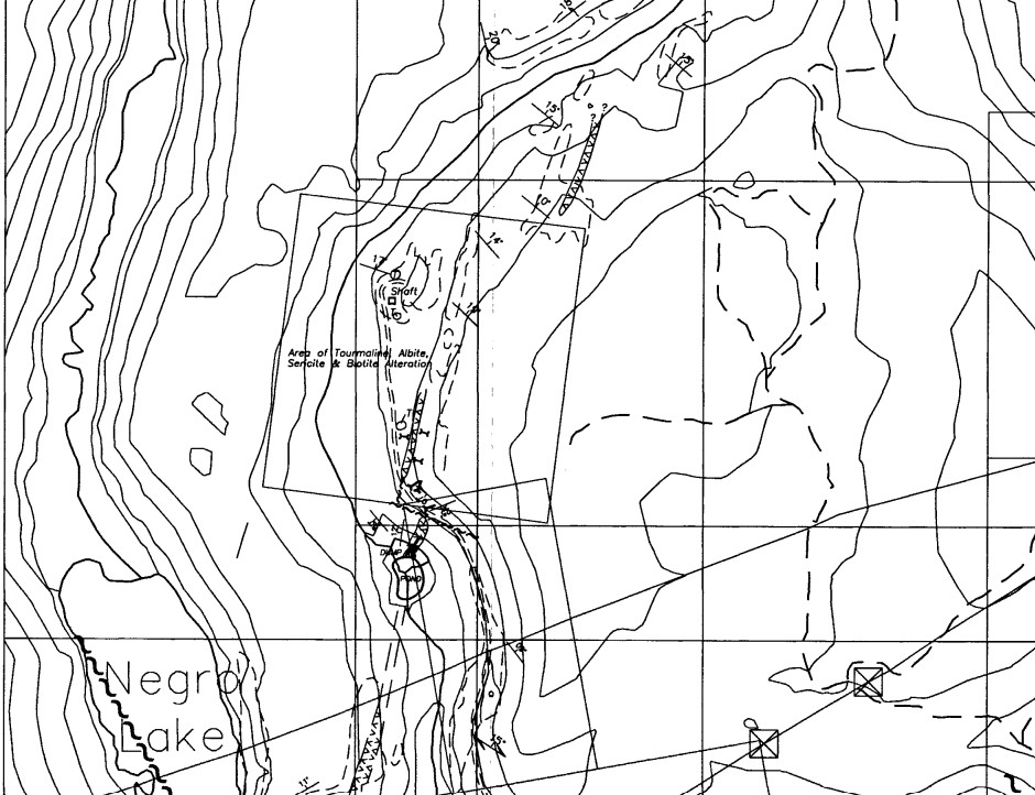In ARIS 26131 about 400 meters northeast of Negro Lake and immediately west of the gabbro dike on the DA Vent property there is local development of vent-related alteration, including tourmalinization, albitization, sericite and biotite. The alteration is evident on surface over a north-south strike length of about 250 meters.