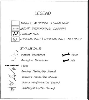 This alteration occurs in the immediate vicinity of a series of quartz veins, some of which are reported to carry gold mineralization. A number of old adits and a shaft are developed in this area of quartz veining and vent alteration. The old workings tested what appears to be two separate styles of quartz veining; a flat-lying set which consists of a few larger quartz veins, up to 1.5 meters thick, and a more complex suite of steep-dipping, thinner veins that are rarely as thick as 20 cm. The tourmalinization, albitization and sericite are closely associated with the steeply dipping quartz veins.
